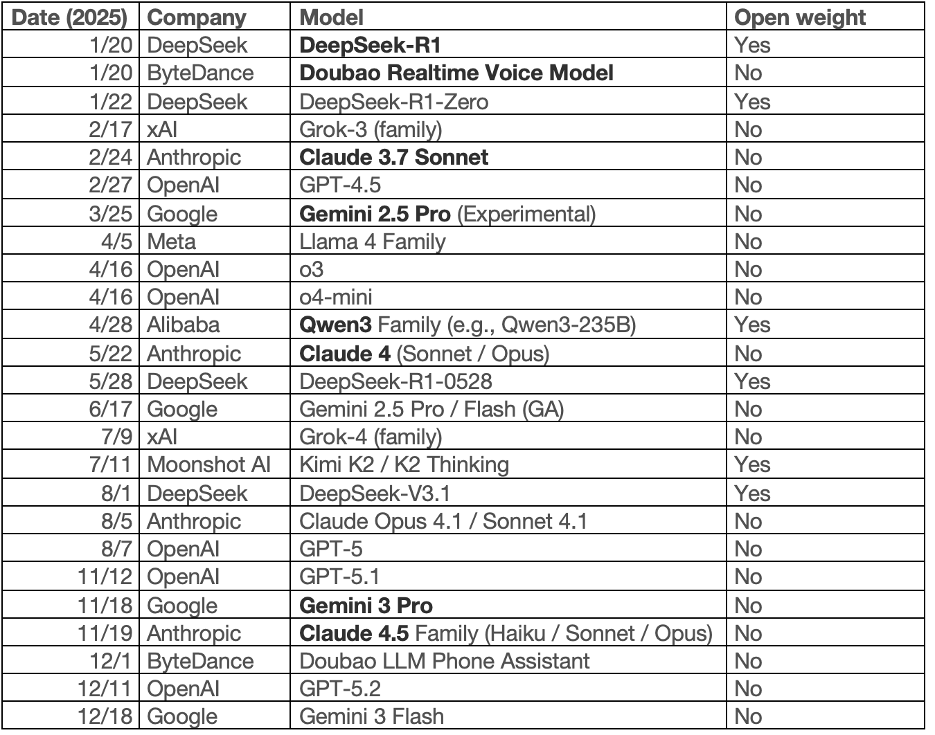 2025是名副其实的“百模大战”,各家厂商的模型呈交替领先的态势2。我让GPT总结了2025年主要model的发布时间线,可以看到几乎每隔一两个月各家厂商就会有一次小的更新。我加粗标注了其中一些我用过的模型,美国的闭源模型都各领风骚,而国内的开源模型则是断档式领先:DeepSeek不用说引领了开源reasoning model的热潮,Qwen3则成为学术界训练RL最好的选择。大部分这些model在各种benchmark的榜单都已经打爆了,所以单纯看榜单的score已经没有太大意义。