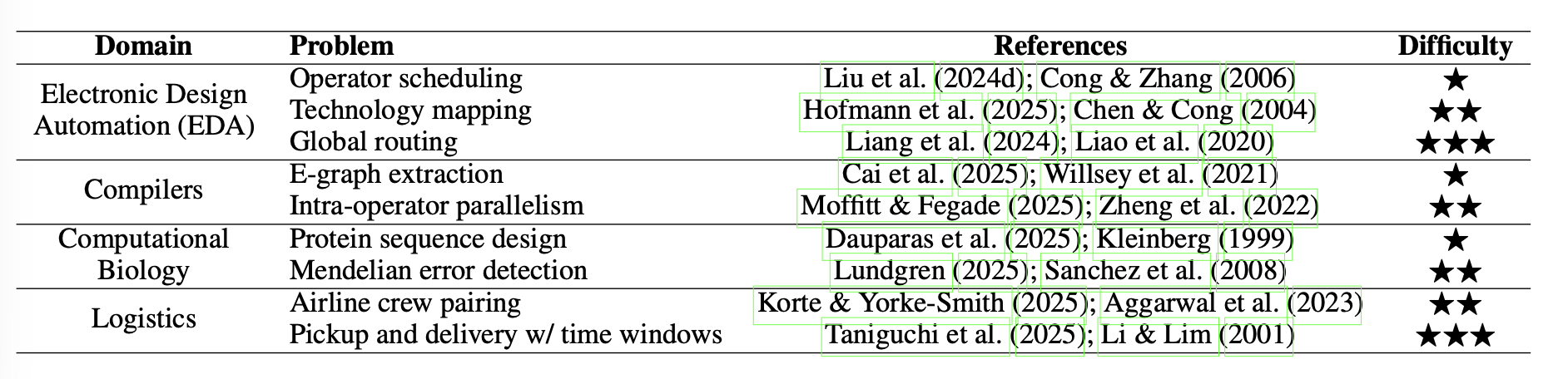 在科学和工程领域,很多问题都是 NP-hard 的组合优化,在大规模数据上基本找不到最优解,所以现在大量的工业软件上基本上都是采用 heuristic 解决,而 heuristic 往往需要丰富的人工经验,我们想知道 LLM 在我们最关心的实际任务上,究竟能把算法设计得多好。所以我们找了系统、生物、物流、芯片设计里的9个组合优化问题,让 LLM 以 agentic 的方式去生成这些问题对应的 heuristic 看最终能达到什么水准。