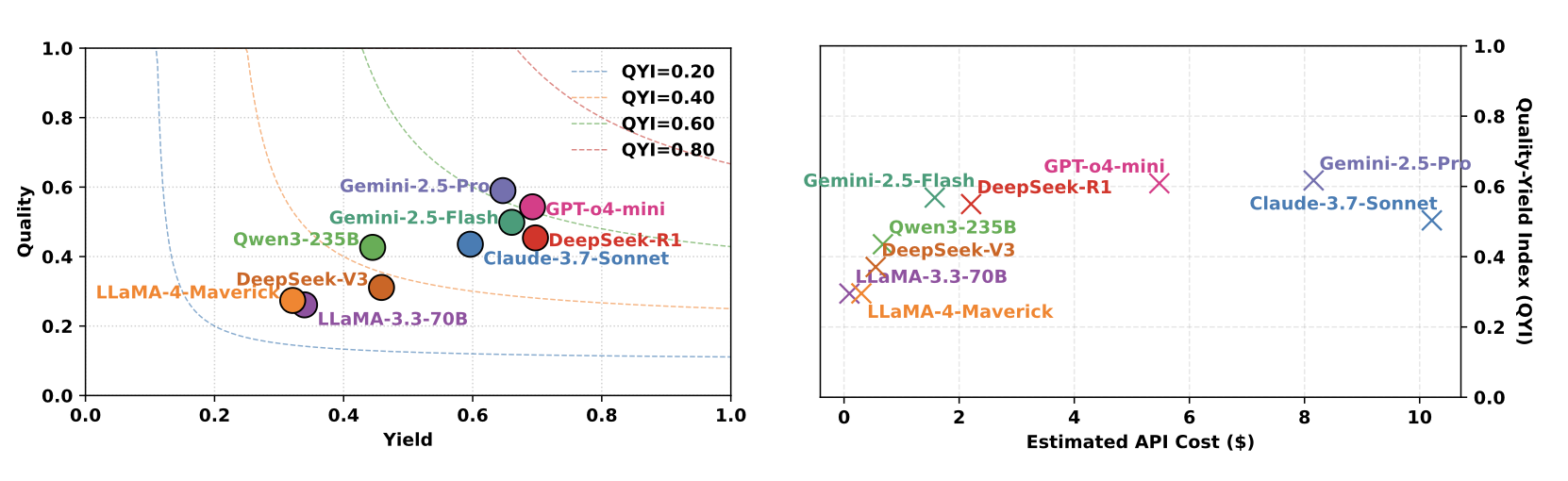 \[\texttt{QYI}=\frac{(1+\beta^2)\cdot \texttt{Quality}\cdot\texttt{Yield}}{(\beta^2\cdot\texttt{Quality}) + \texttt{Yield}}\]QYI=1 表示达到专家水平,QYI=0 表示完全失败。这个指标比单纯看通过率(pass@k)更能反映 LLM 在多轮迭代中综合解决问题的实力。
