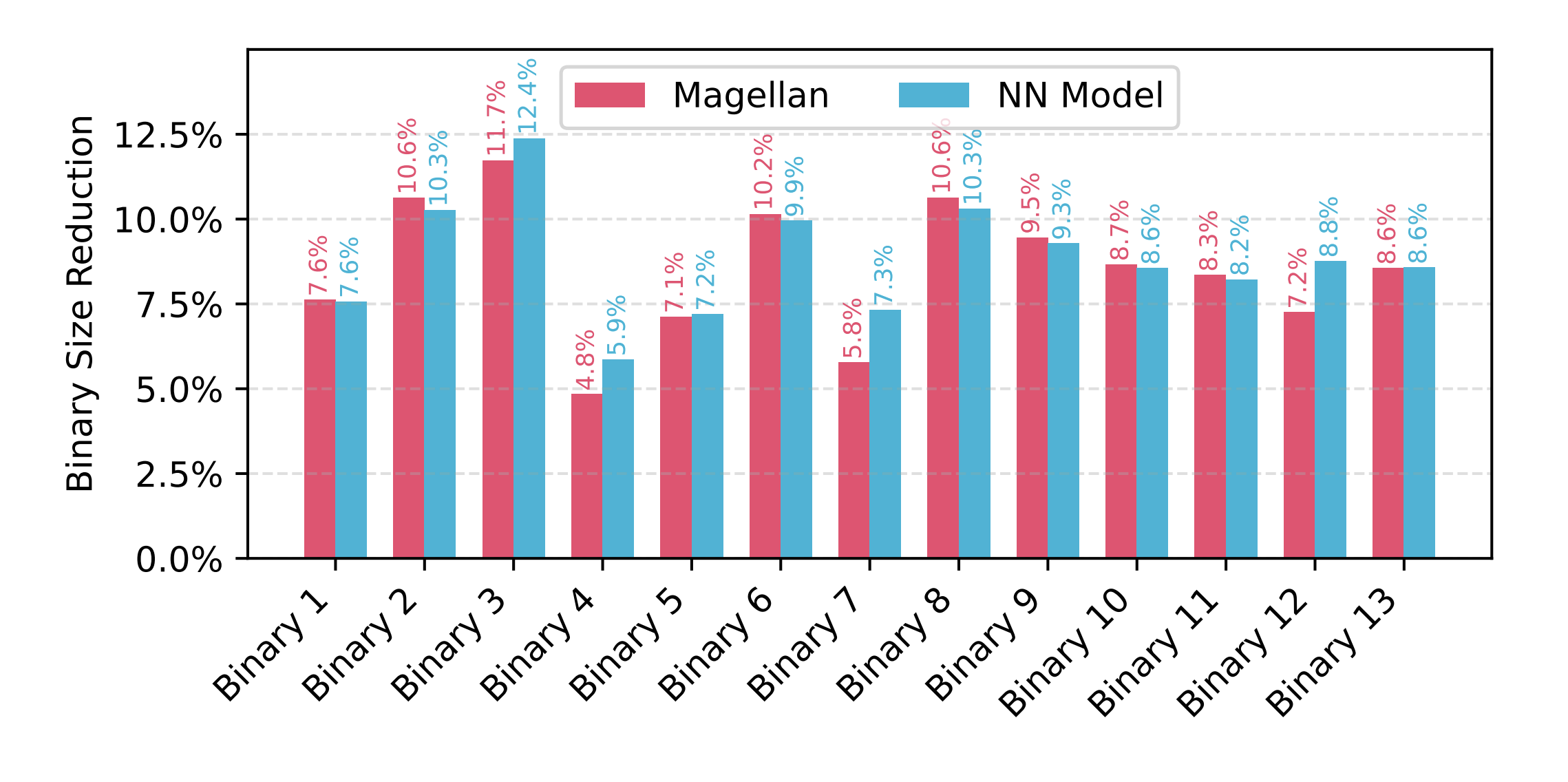 我们还测试了这份代码的泛化能力:我们将该规则应用到不同时间点快照的代码库以及十多个不同的生产级二进制程序(涵盖搜索、嵌入式等不同领域)上,其优化效果依然稳健,平均减少代码体积8.79%,与一个需要大量数据训练和集成的神经网络策略效果相当,且好处在于无需重新训练。