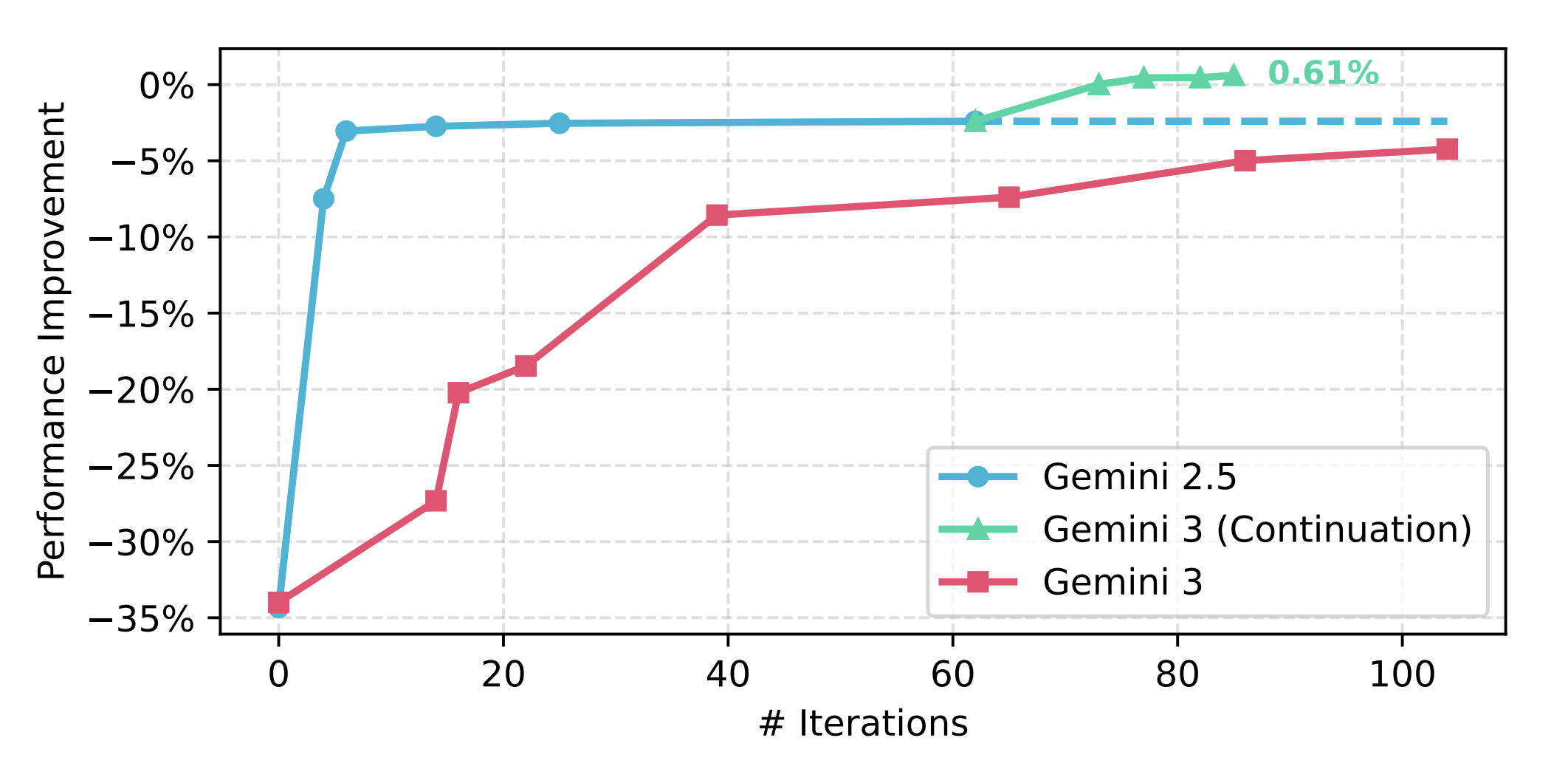 而真正的转机是11月底的时候 Gemini 3 对外发布,一开始我们也没有觉得模型提升会带来多大帮助,但我们低估了基模提升对整个领域的创造性改变。当我们把 Gemini-2.5-Pro 生成的最好程序喂给 Gemini-3-Pro 作为初始程序后,Gemini 3迭代了一夜,竟然发现了更好的内联算法,直接超过了 LLVM 开满优化的设置(这也是整个社区二十几年来维护的成果),最终达到0.61%的提升。虽然只是不到1%的性能提升,但是这是之前传统方法(包括使用神经网络)都从未达到过的突破。非常底层的通用优化、大规模数据集、非常强大的基线程序都说明这一点点提升的来之不易。