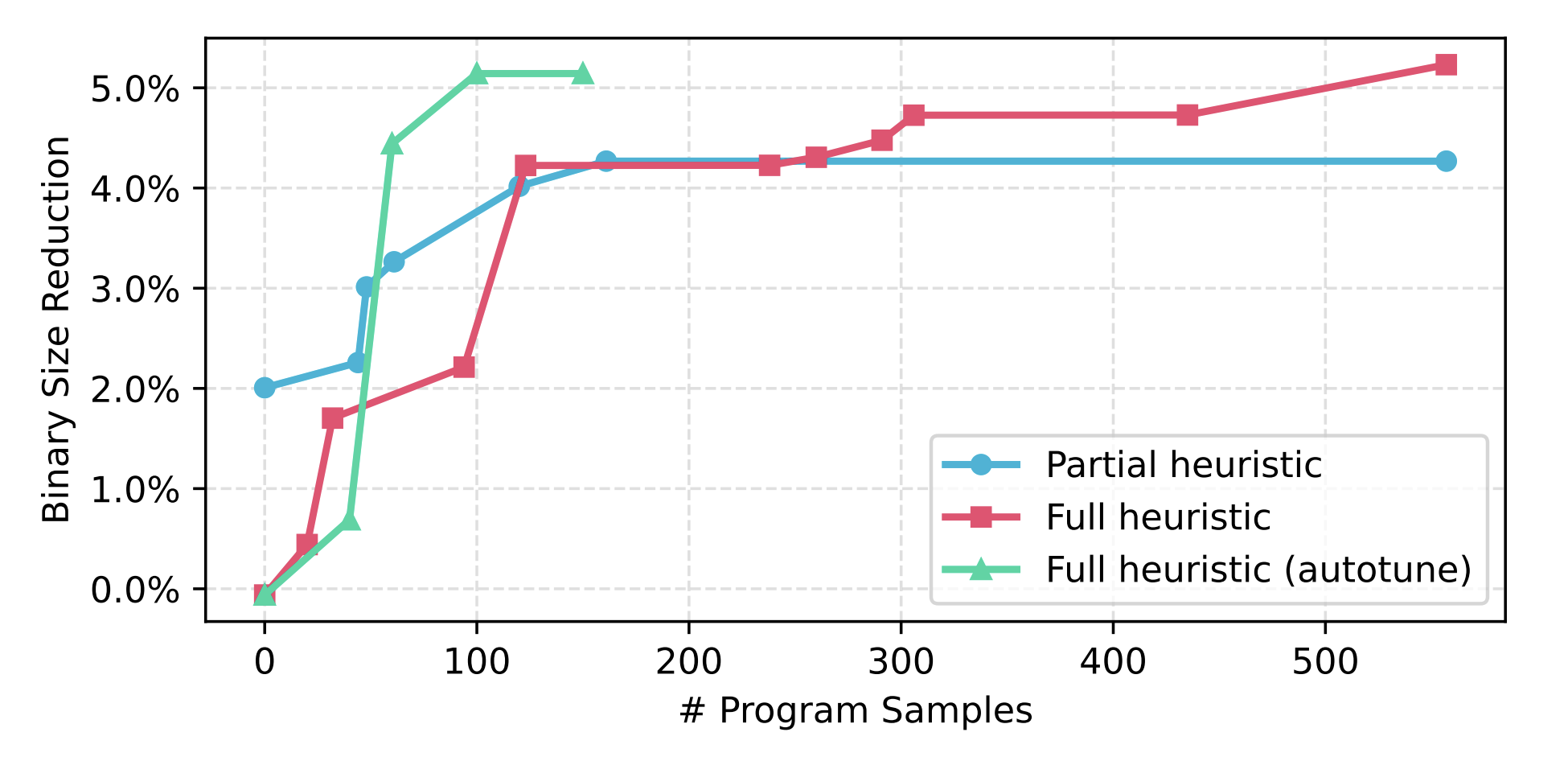 另外一组试验则是进一步开启了调优器,可以看到它大大提升了 Magellan 的搜索效率,大概只需100个程序的采样评估,它就可以达到超过5%的内联体积缩小。